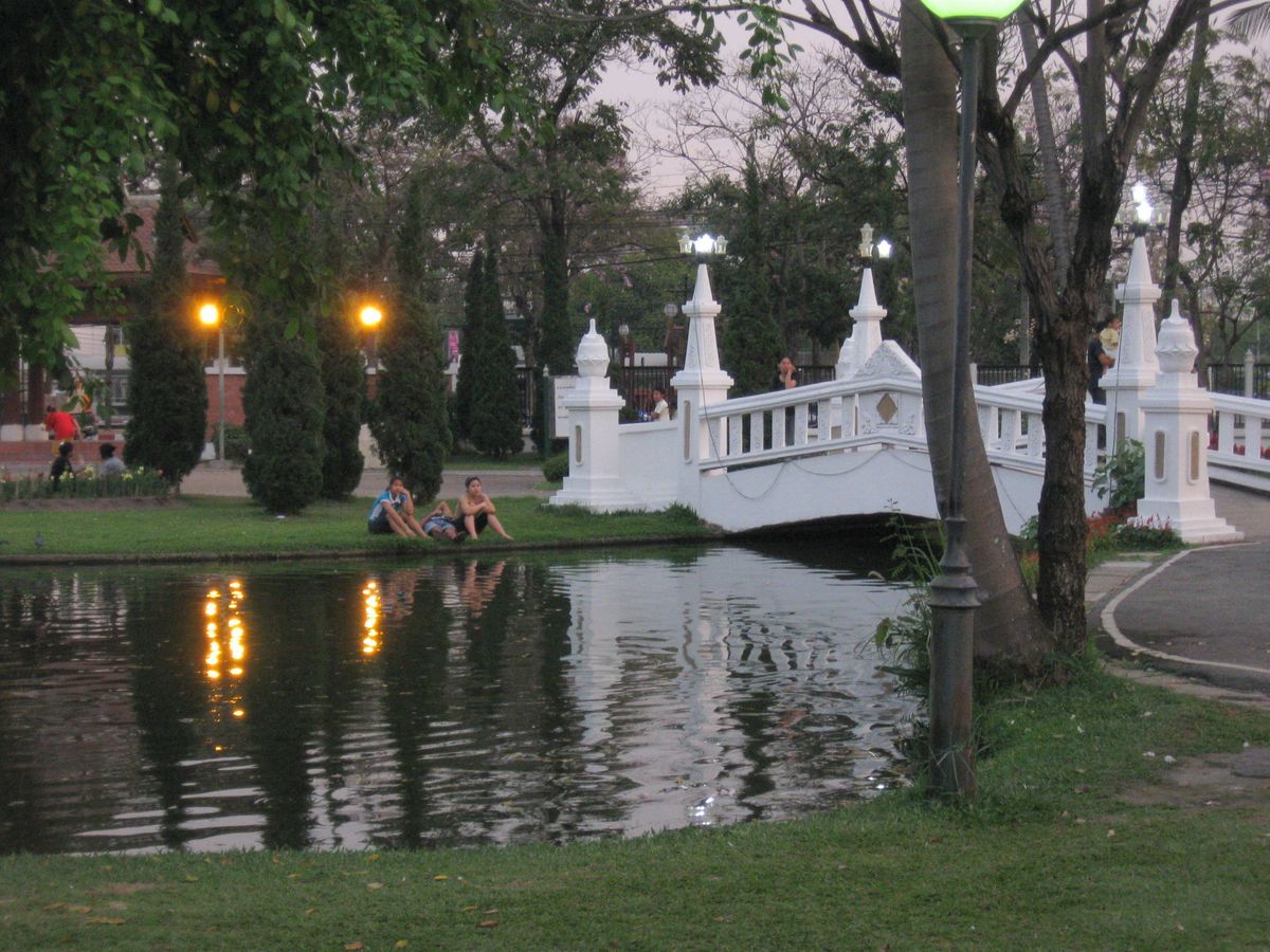 Anschließend sind wir mit dem Moped durch die Gassen von Chiang Mai herumgetuckert und sind dann in den Suan Buak Had Park. Was wir dort gesehen haben, konnten wir gar nicht glauben. In dem total hübschen und liebevoll angelegten Garten treiben sich eine Menge Thais herum, die Sport machen. Und das bei geschätzten 30 Grad + im Schatten. Von Federball über Aerobic und Laufen bis hin zu Fußball, aber auch Sportarten, die wir gar nicht kannten. Ein Teil hat Volleyball mit den Füßen gespielt und ein anderer Teil hat ebenfalls mit den Füßen ein Ball in einen Korb, der wie ein Korb von Basketball benutzt wurde, aber auf einem Seil hängt und von 3 Seiten offen ist, gespielt. War echt lustig zum Zuschauen, aber viel zu heiß und anstregend zum Selbermachen.